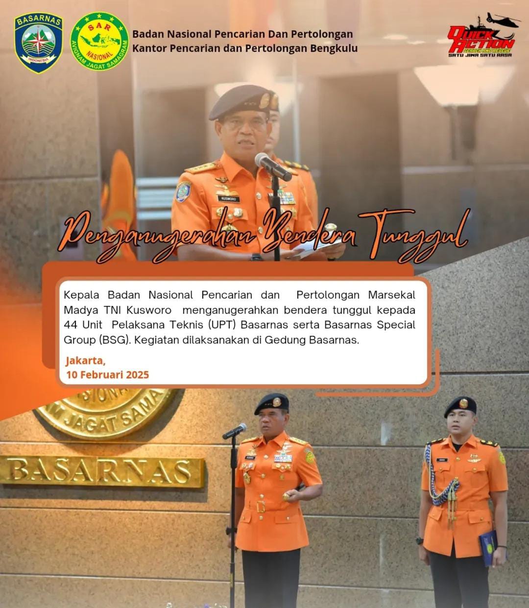 Kepala Badan Nasional Pencarian dan Pertolongan Marsekal Madya TNI Kusworo menganugerahkan bendera tunggul kepada 44 Unit Pelaksana Teknis (UPT) Basarnas serta Basarnas Special Group (BSG). Kegiatan dilaksanakan di Gedung Basarnas.