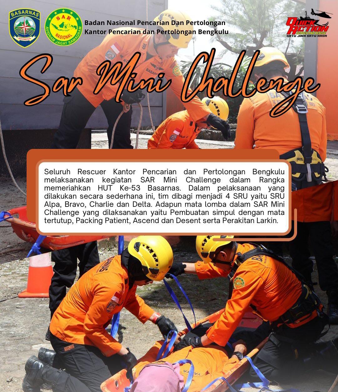 Seluruh Rescuer Kantor Pencarian dan Pertolongan Bengkulu melaksanakan kegiatan SAR Mini Challenge dalam Rangka memeriahkan HUT Ke-53 Basarnas.